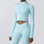 A: Yes, the Light Blue Zipped Fitted Sports Top can be worn comfortably in spring, summer, autumn, and winter. - Q: What is the fabric composition?